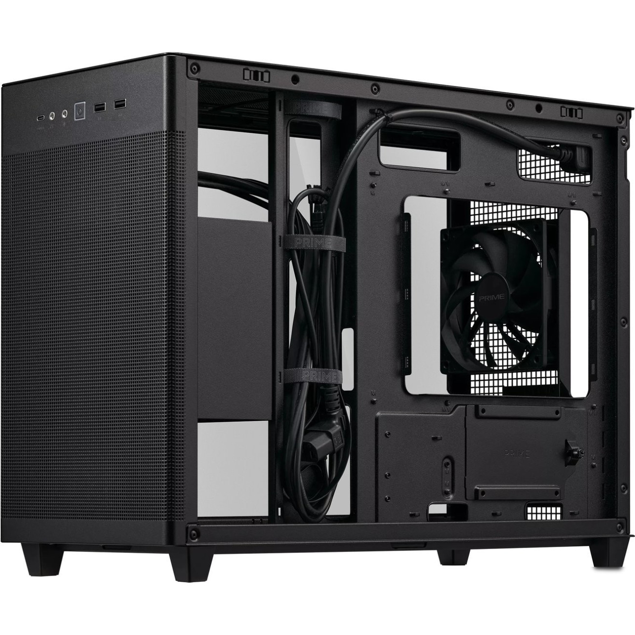 Mini Tower, БП отсутствует, для плат micro-ATX/mini-ITX, в комплекте 1 вентилятор, окно: закаленное стекло, видеокарта до 338 мм, охлаждение ЦП до 170 мм, пылевые фильтры, 2xUSB-A 3.2 5Гбит/с, 1xUSB-C 3.2 10Гбит/с, цвет черный