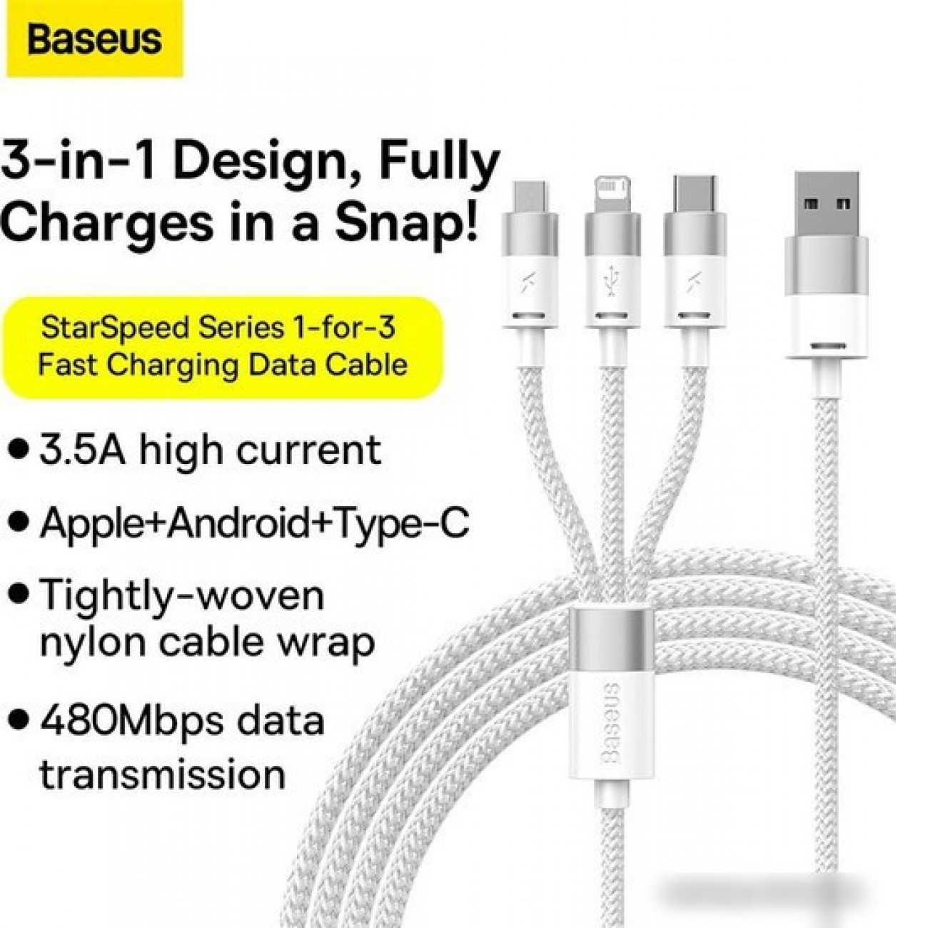 Основные характеристики Кабель Baseus One-For-Three Fast Charging Data Cable 3.5A USB Type-A - USB Type-C/microUSB/Lightning (0.5 м, белый)