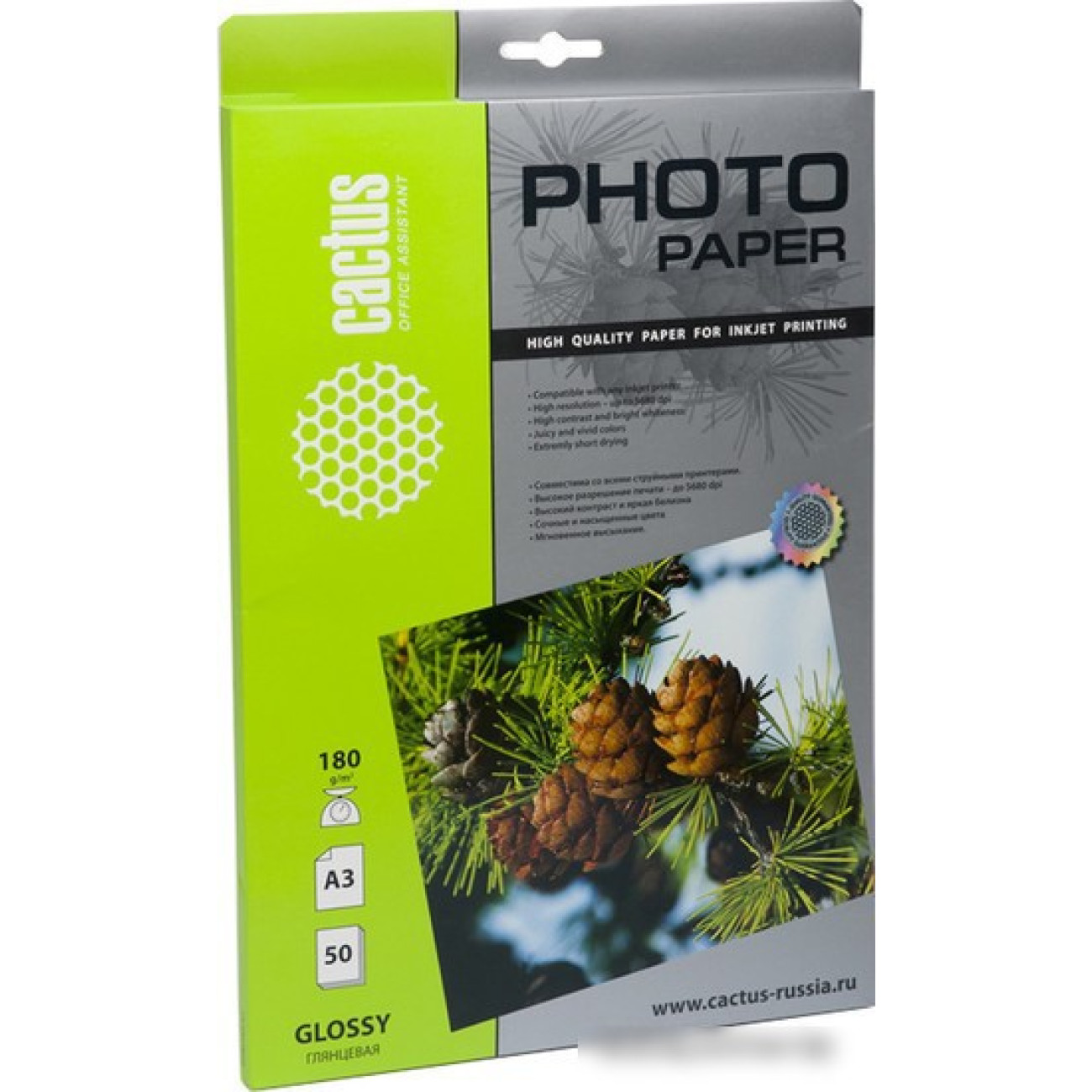 Основные характеристики Фотобумага CACTUS Глянцевая A3 180 г/кв.м. 50 листов (CS-GA318050)
