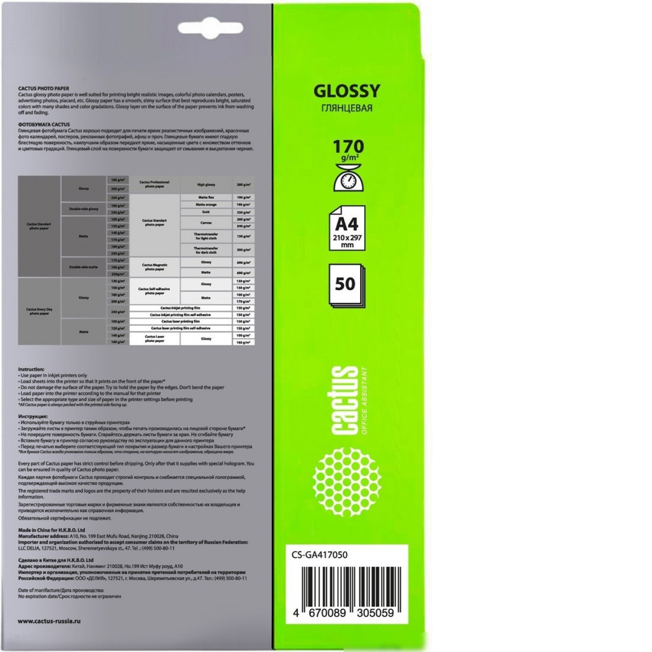 Основные характеристики Фотобумага CACTUS Глянцевая A4 170 г/м2 50 листов CS-GA417050