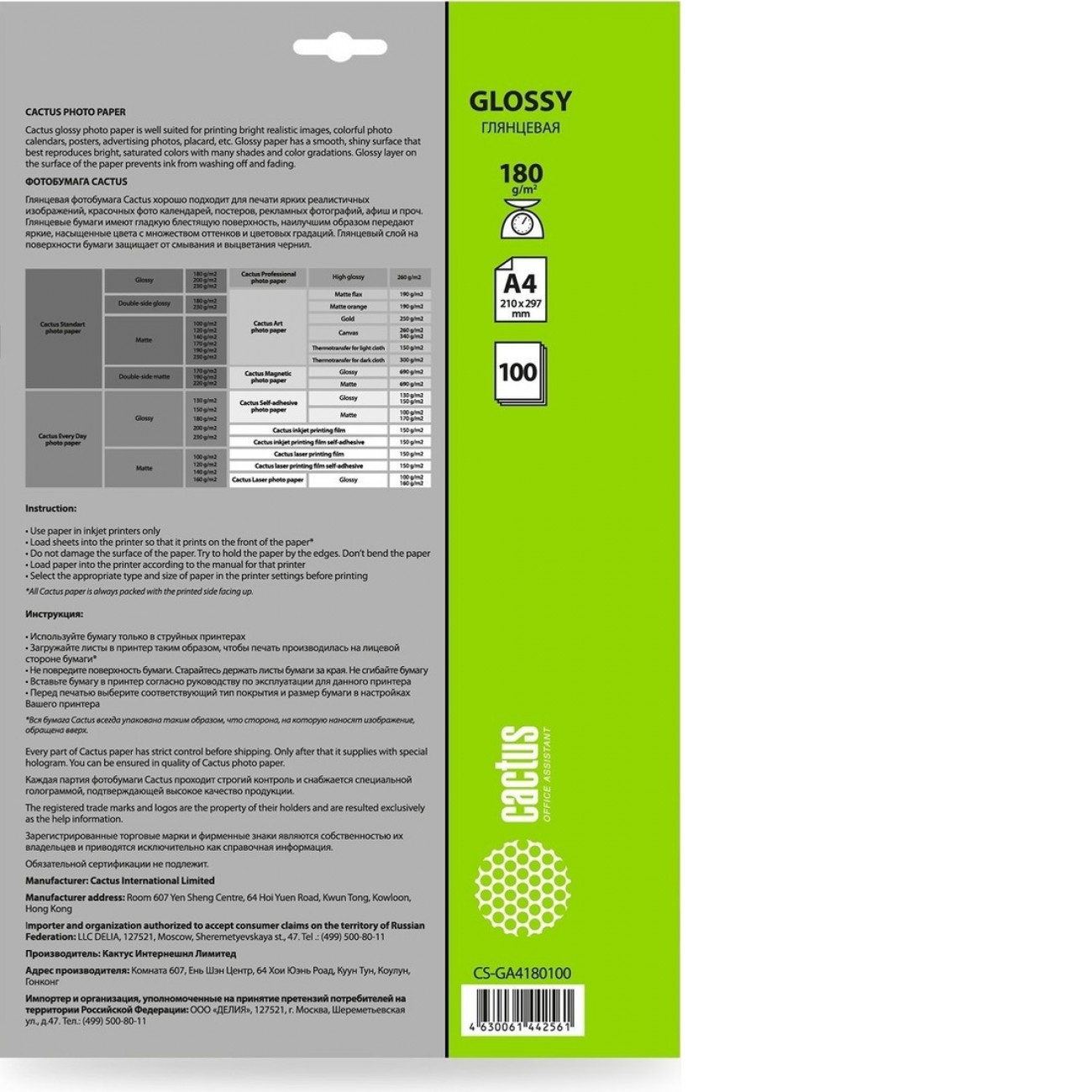 Основные характеристики Фотобумага CACTUS Глянцевая A4 180 г/кв.м. 100 листов CS-GA4180100