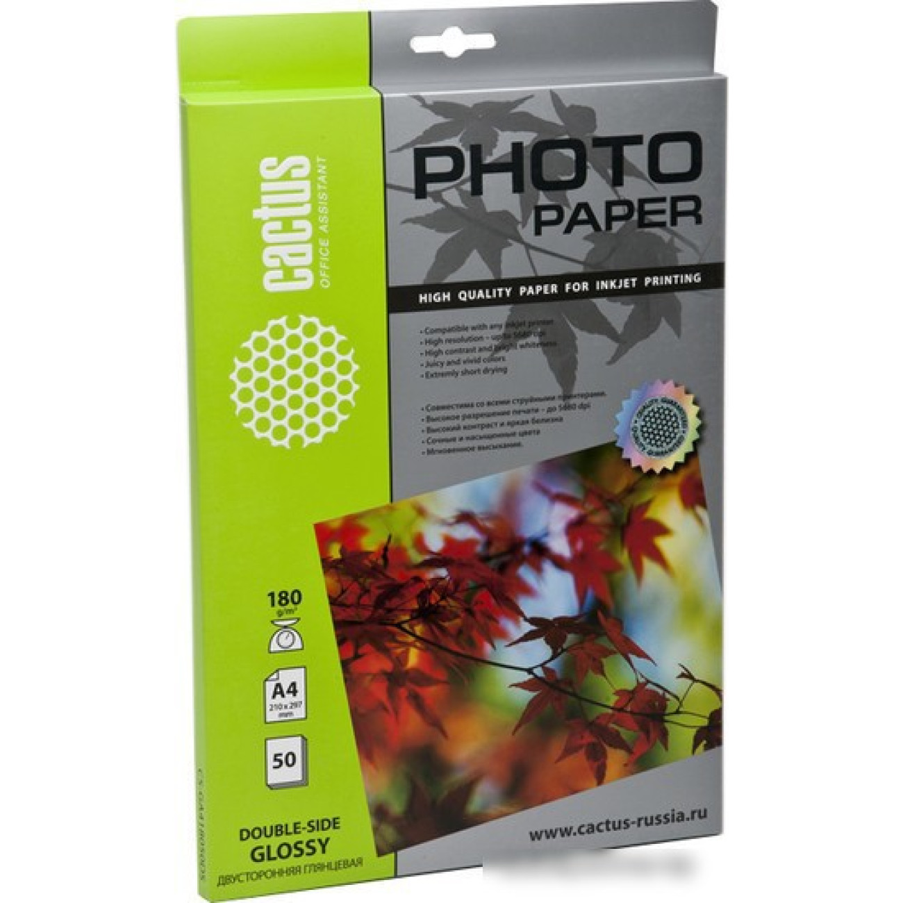 Основные характеристики Фотобумага CACTUS Глянцевая A4 180 г/кв.м. 50 листов (CS-GA418050DS)