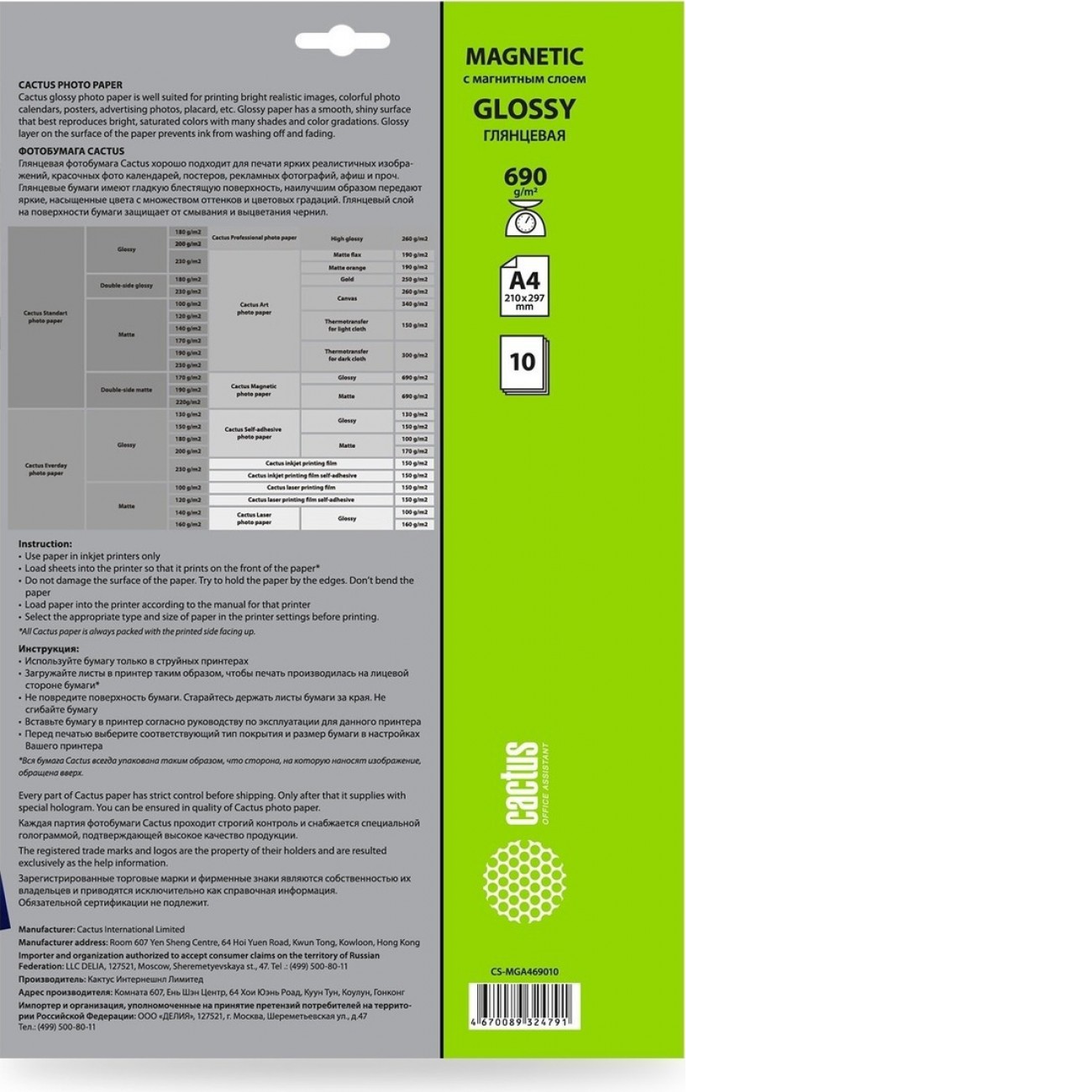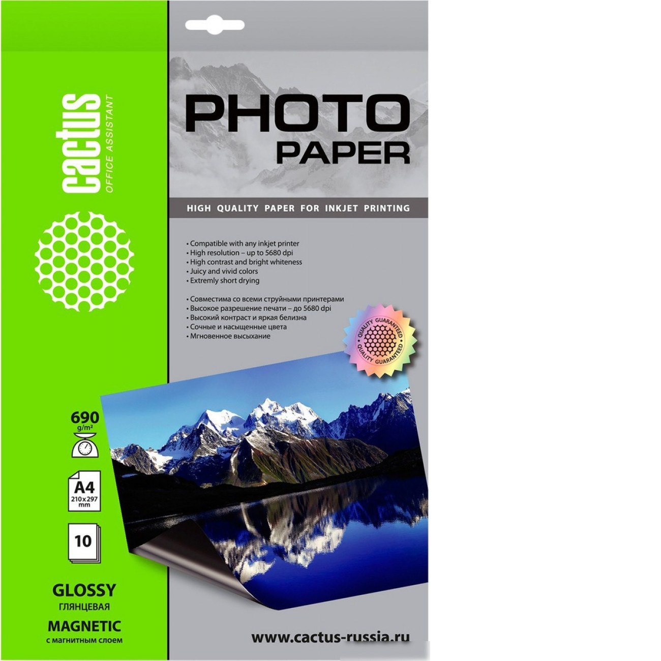 Основные характеристики Фотобумага CACTUS Глянцевая магнитная A4 690 г/кв.м. 10 листов CS-MGA469010