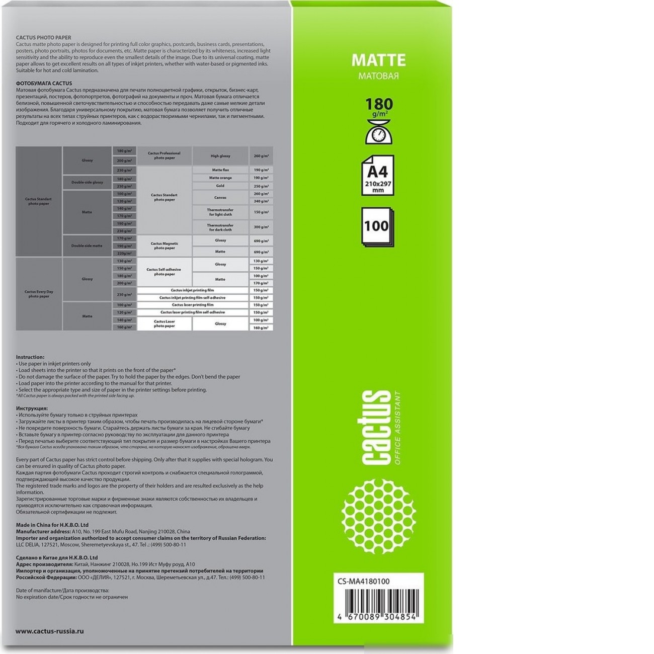 Основные характеристики Фотобумага CACTUS Матовая A4 180 г/м2 100 листов CS-MA4180100