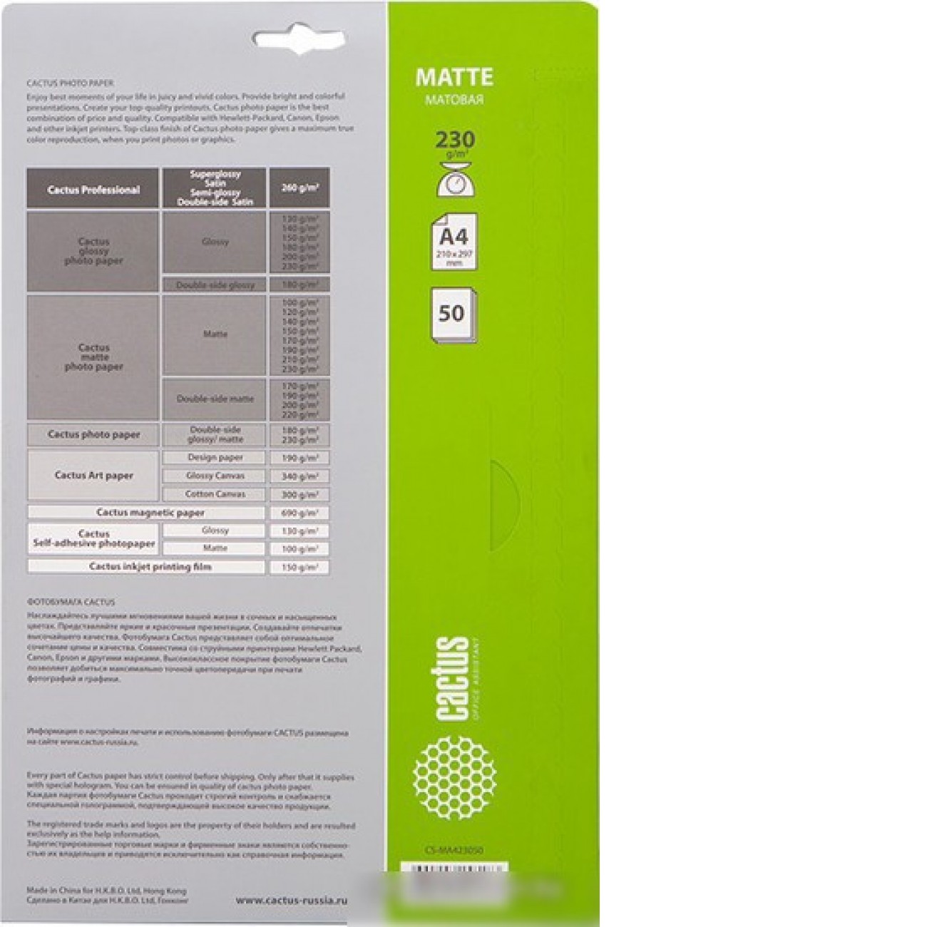 Описание Фотобумага CACTUS Матовая A4 230 г/кв.м. 50 листов(CS-MA423050)