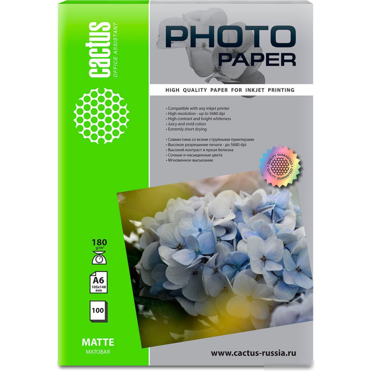 Основные характеристики Фотобумага CACTUS Матовая A6 10x15 180 г/м2 100 листов CS-MA6180100
