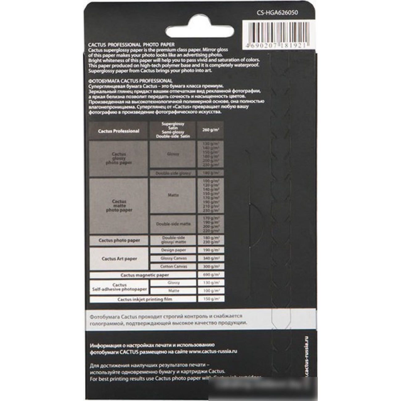 Основные характеристики Фотобумага CACTUS Суперглянцевая A6 260 г/кв.м. 50 листов (CS-HGA626050)