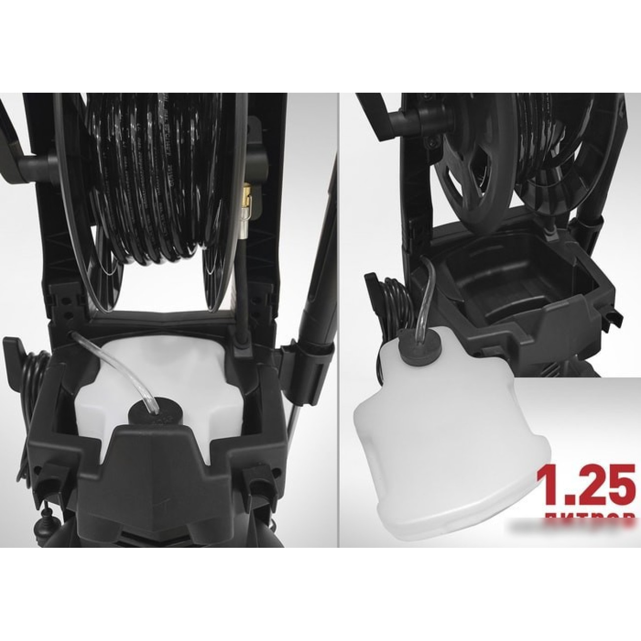 Комплектация- Пистолет высокого давления с регулируемой грязевой фрезой. - 5м шланг высокого давления c системой E-click. - Штуцер подключения к садовому шлангу 3/4” со встроенным фильтрующим элементом. - Встроенный пенный генератор с емкостью для моющ, 25 л.