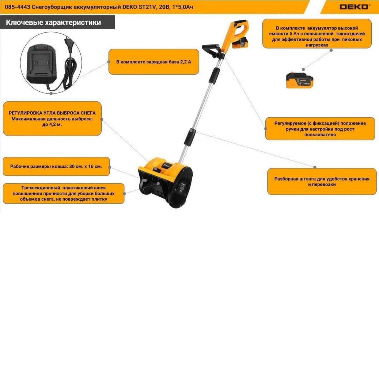 Основные характеристики Снегоуборщик Deko ST21V 085-4443 (с 1-им АКБ)