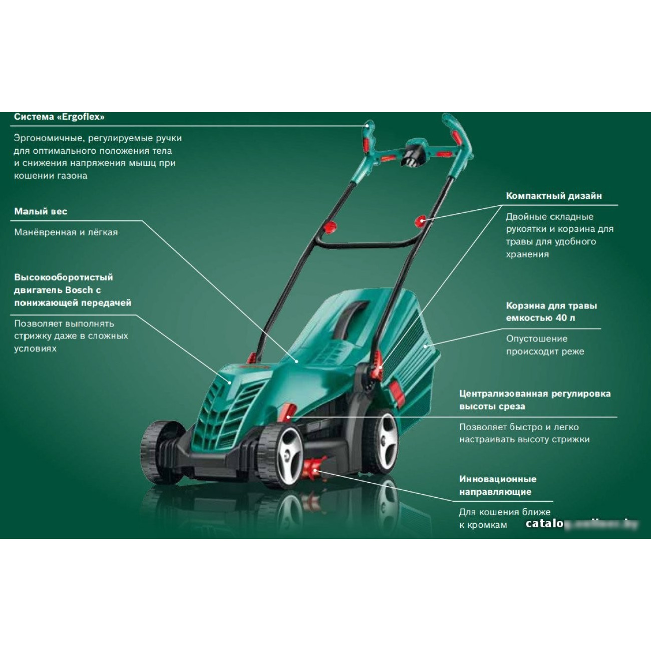 роторная газонокосилка, электрический двигатель, 1300 Вт, 1.76 л.с., ширина скашивания: 34 см, жесткий травосборник 40 л
