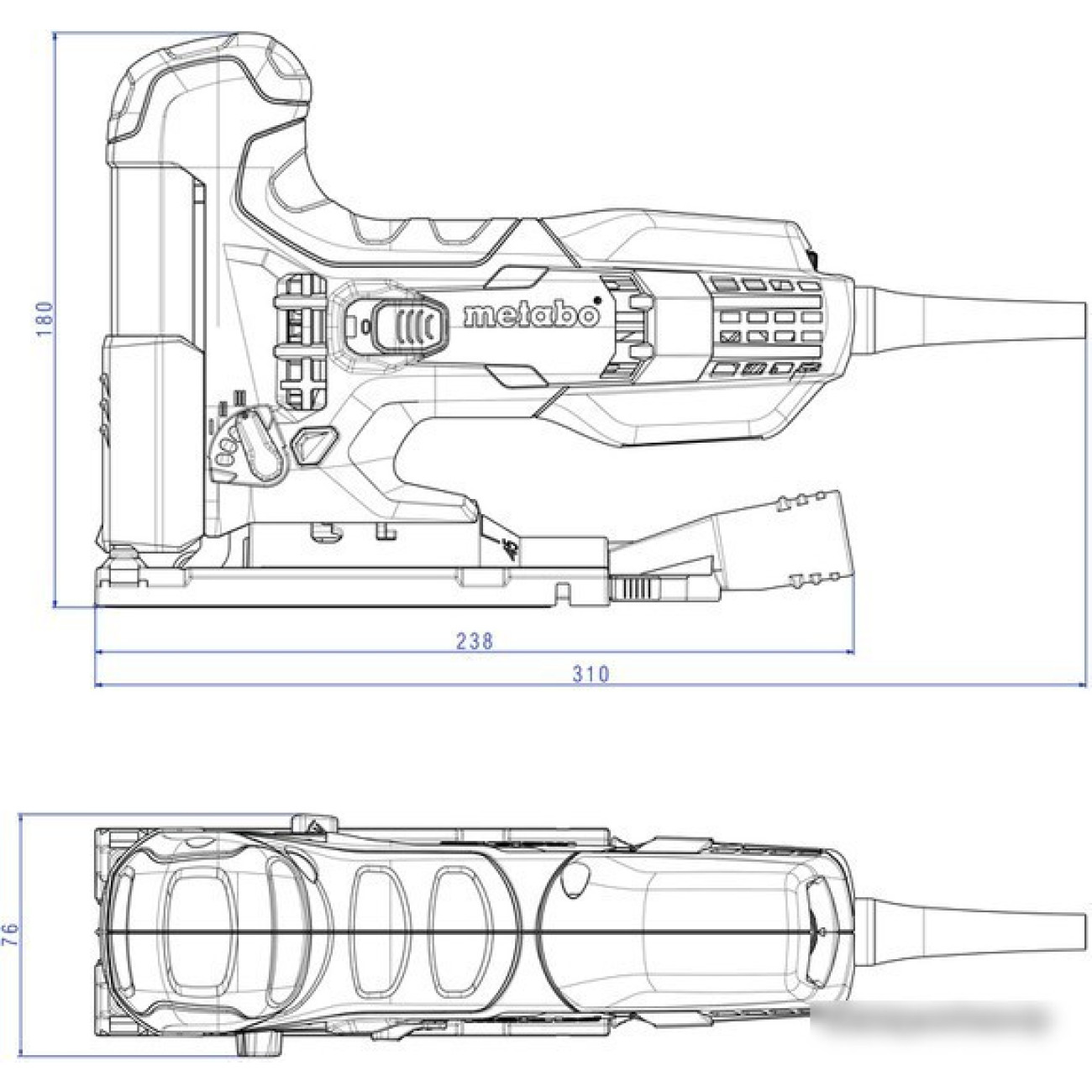 710 Вт, грибообразная рукоятка, глубина пропила: 100 мм (дерево), 10 мм (сталь), 1000–3100 ходов/мин, ход пилки: 22 мм, 2 кг