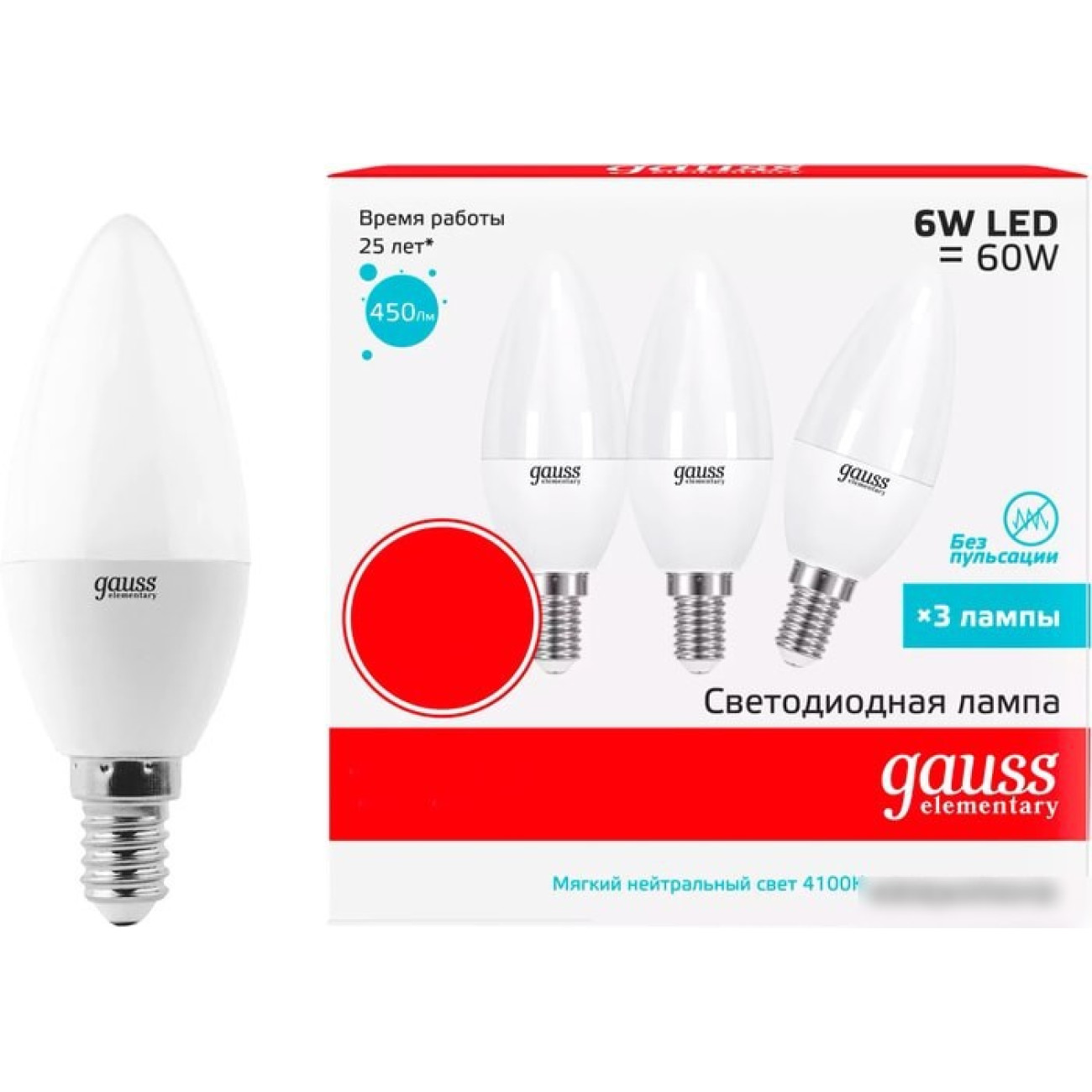 Основные характеристики Светодиодная лампа Gauss Elementary E14 6 Вт 4100К 33126T (3 шт)