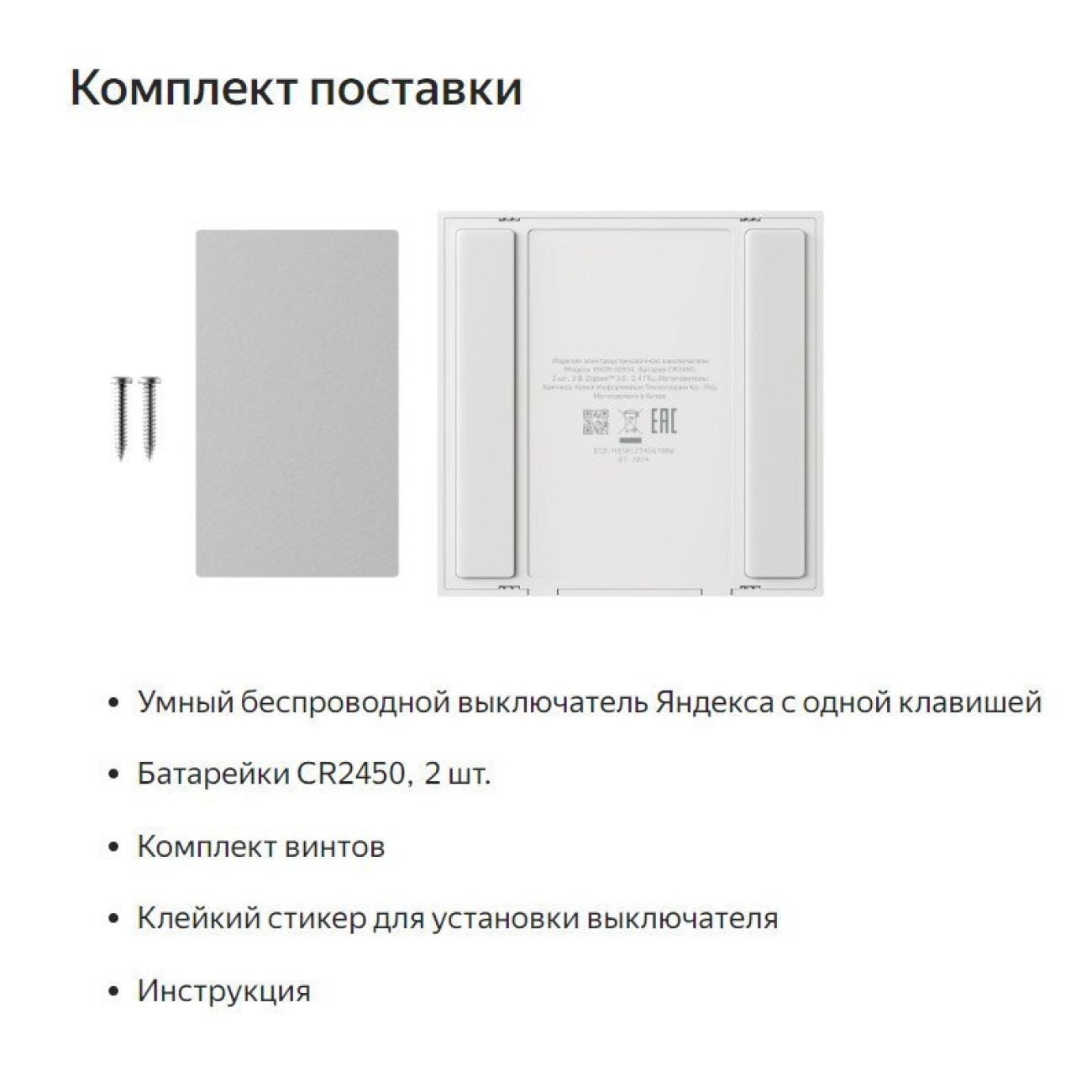 Комплектация2 шт. Комплект винтов Клейкий стикер для установки выключателя Инструкция, Умный беспроводной выключатель Яндекса с одной клавишей Батарейки CR2450
