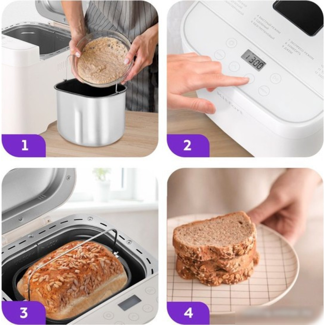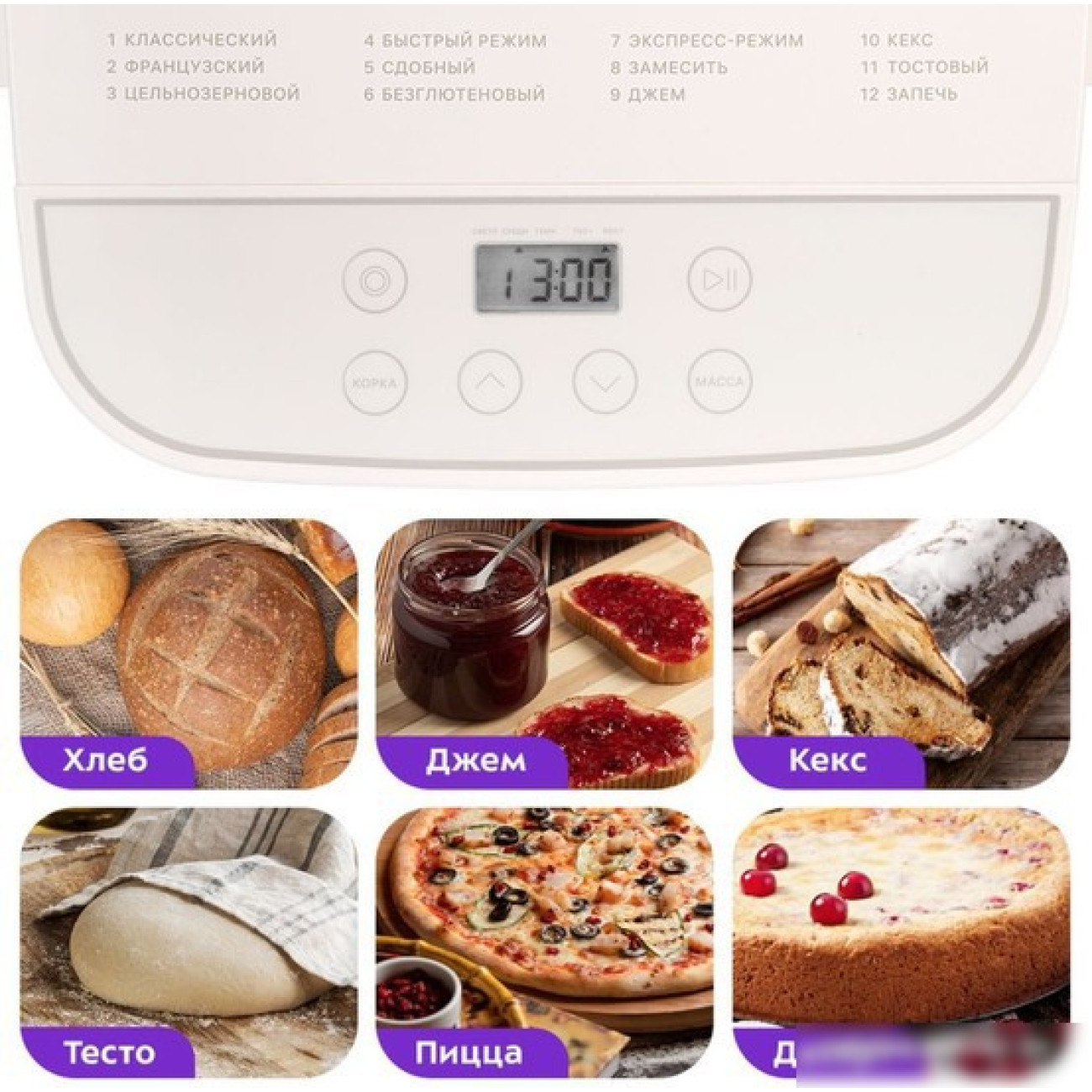 550 Вт, вес выпечки: 900 г, регулировка веса выпечки, 12 программ выпечки, выбор цвета корочки, замес теста