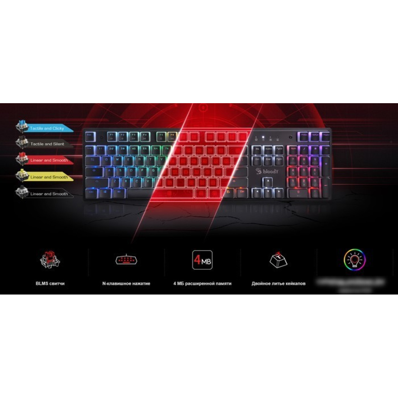 стандартная для ПК, механическая, Bloody BLMS Red, ход линейный, пластик, интерфейс подключения - USB, подсветка, цвет черный