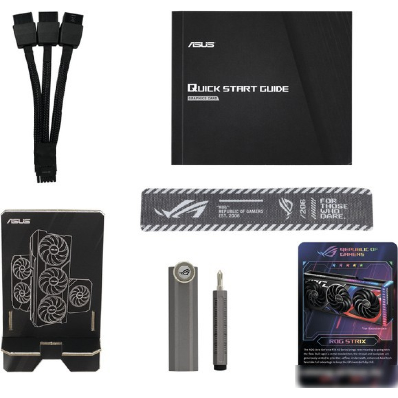 1 коллекционная карточка 1 инструкция по быстрой установке 1 кабель 16pin - 3x 8pin 1 держатель видеокарты ROG 1 липучка Velcro ROG 1 благодарственная карточка