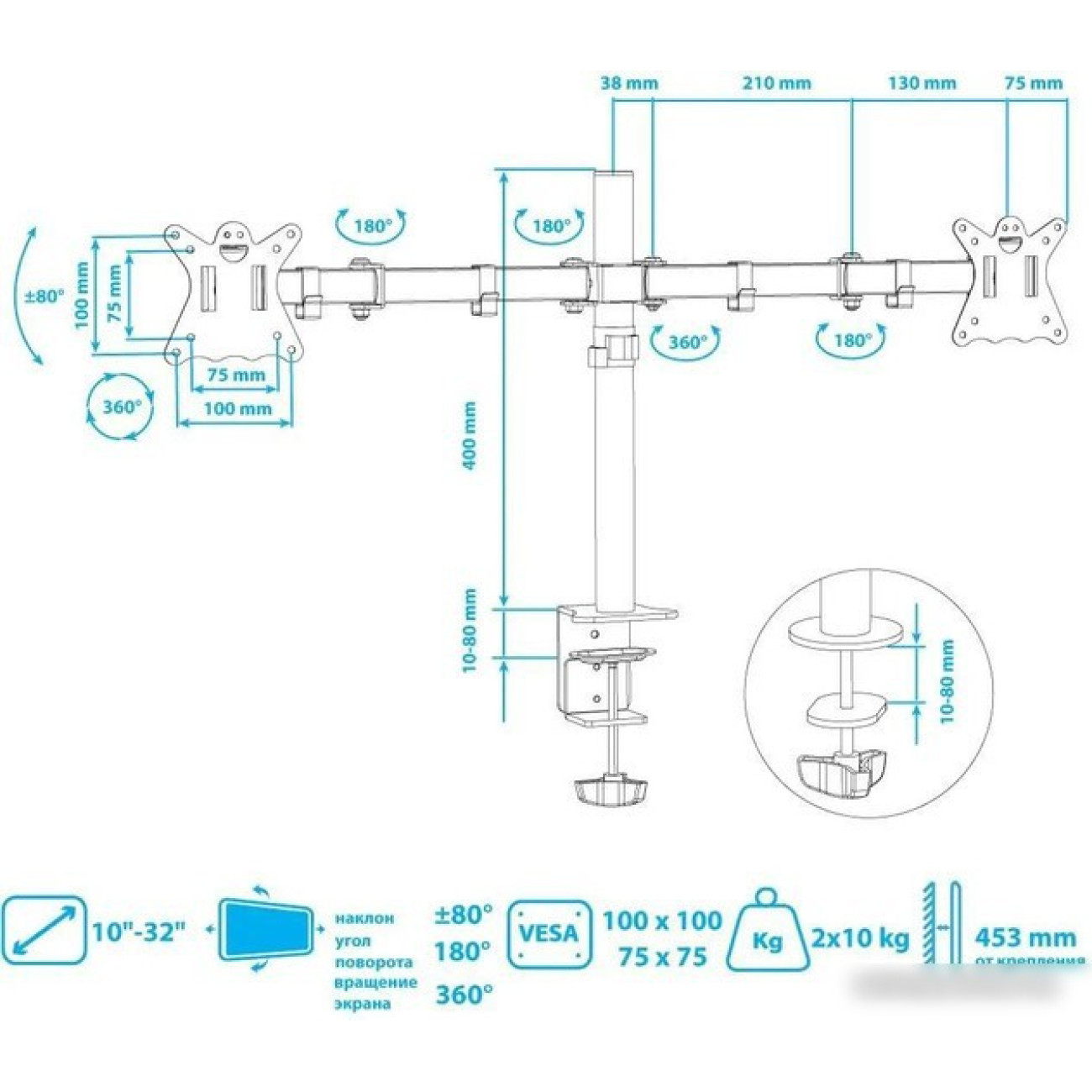 для мониторов, 10-32", 2 монитора, настольный, поворотный, с регулировкой высоты, кабель-канал, струбцинное крепление, наклон 80°, поворот 360°, цвет черный