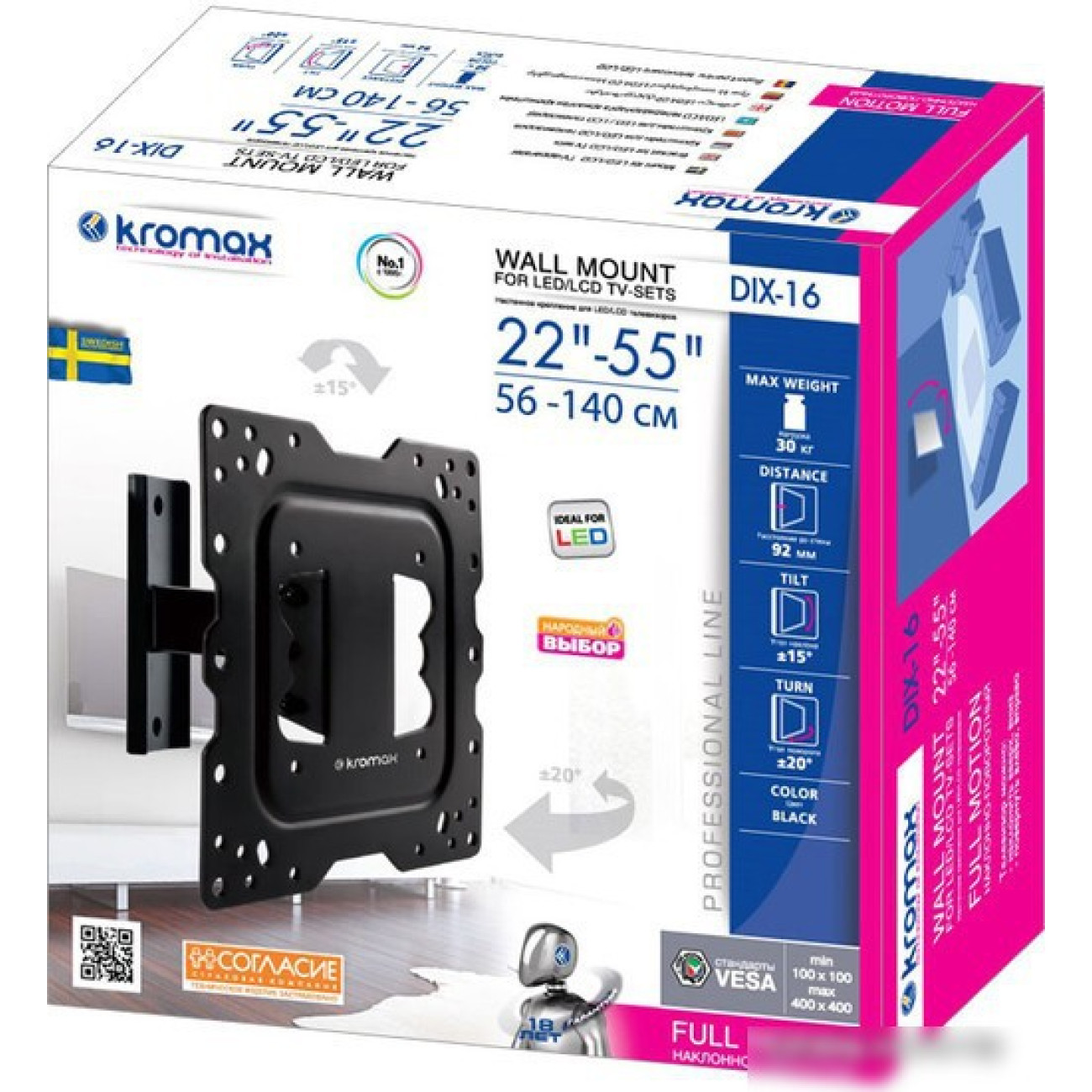 настенный кронштейн для ЖК-телевизора 22-55", наклон 15°, поворот 20°, цвет черный