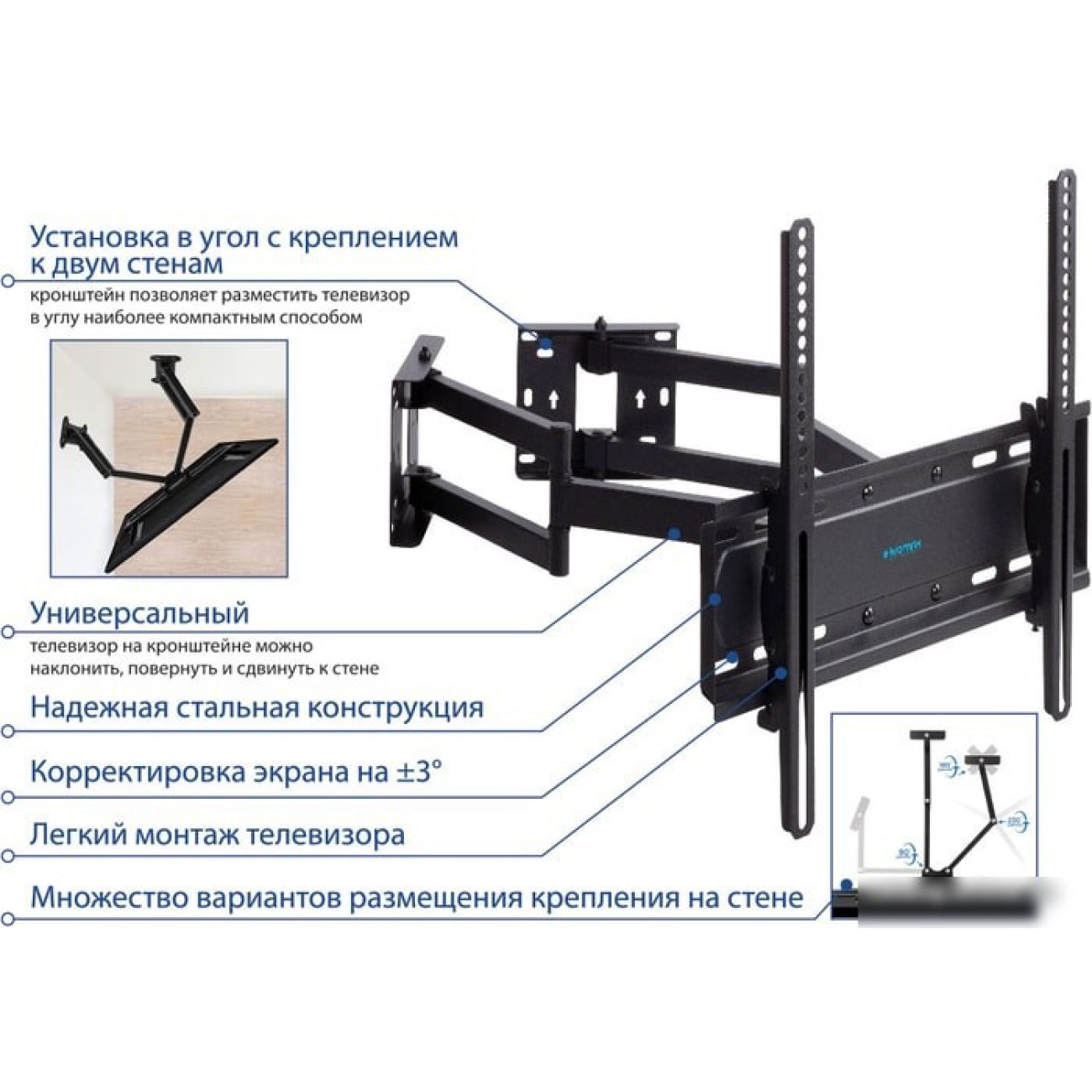 настенный кронштейн для ЖК-телевизора 32-70", наклон 10°, поворот 160°, цвет черный