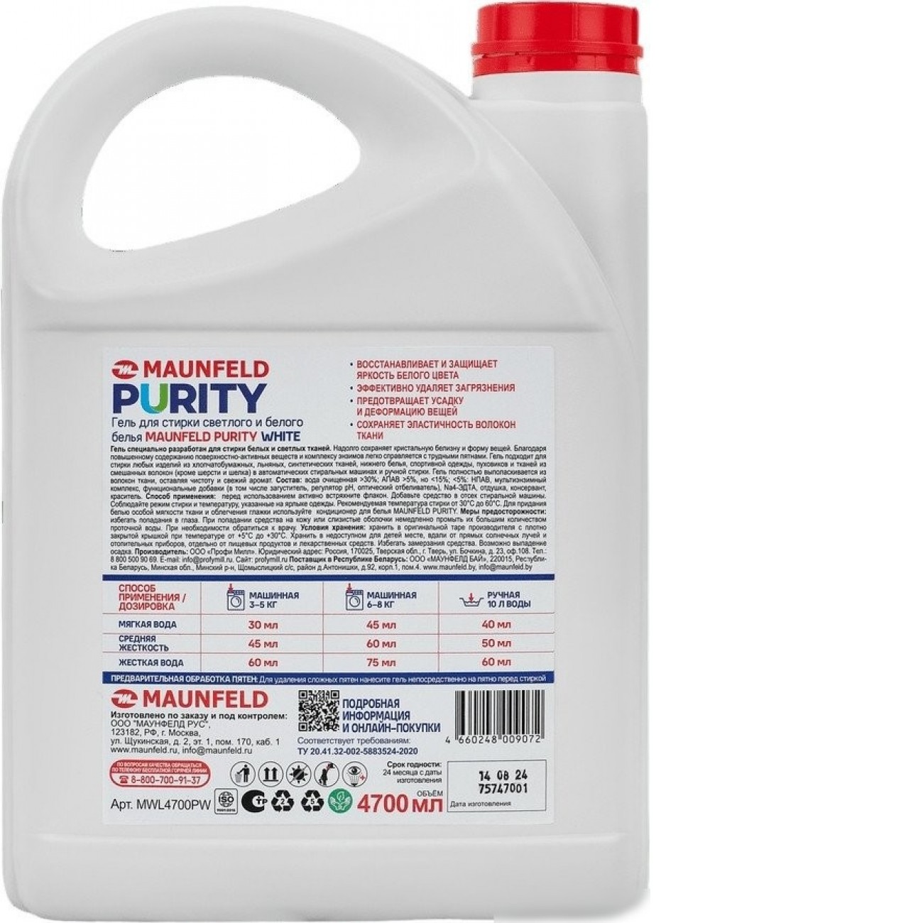 Основные характеристики Гель для стирки MAUNFELD Purity White MWL4700PW 4.7 л