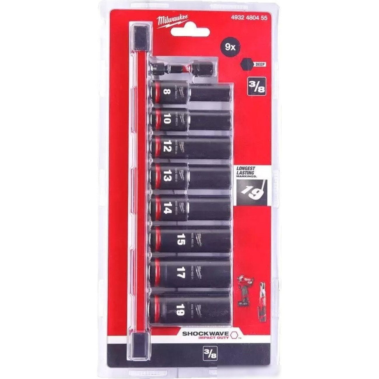 9 шт, головка торцевая, профиль головки: глубокая шестигранная, размер папа (M): 3/8?, рабочий размер 8-19 мм