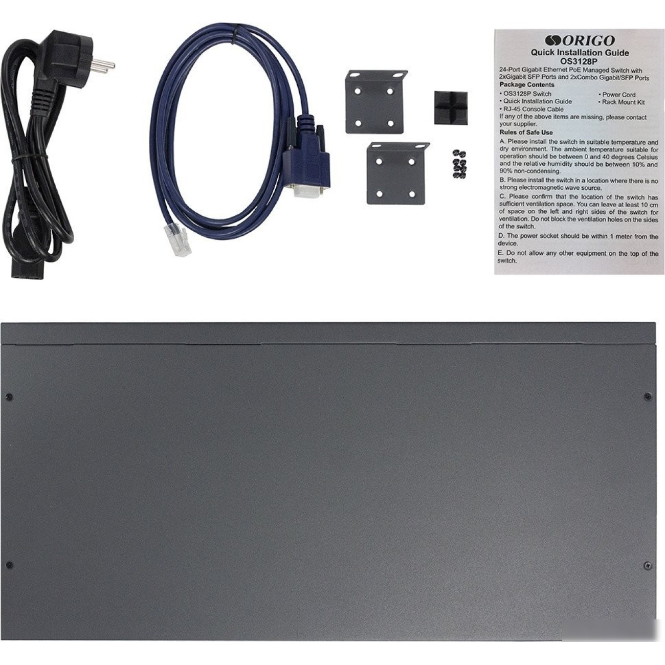 Комплектация• Коммутатор OS3128P/250W • Кабель питания • Консольный кабель с разъемом RJ-45 • Комплект для установки в 19-дюймовую стойку • Краткое руководство по установке
