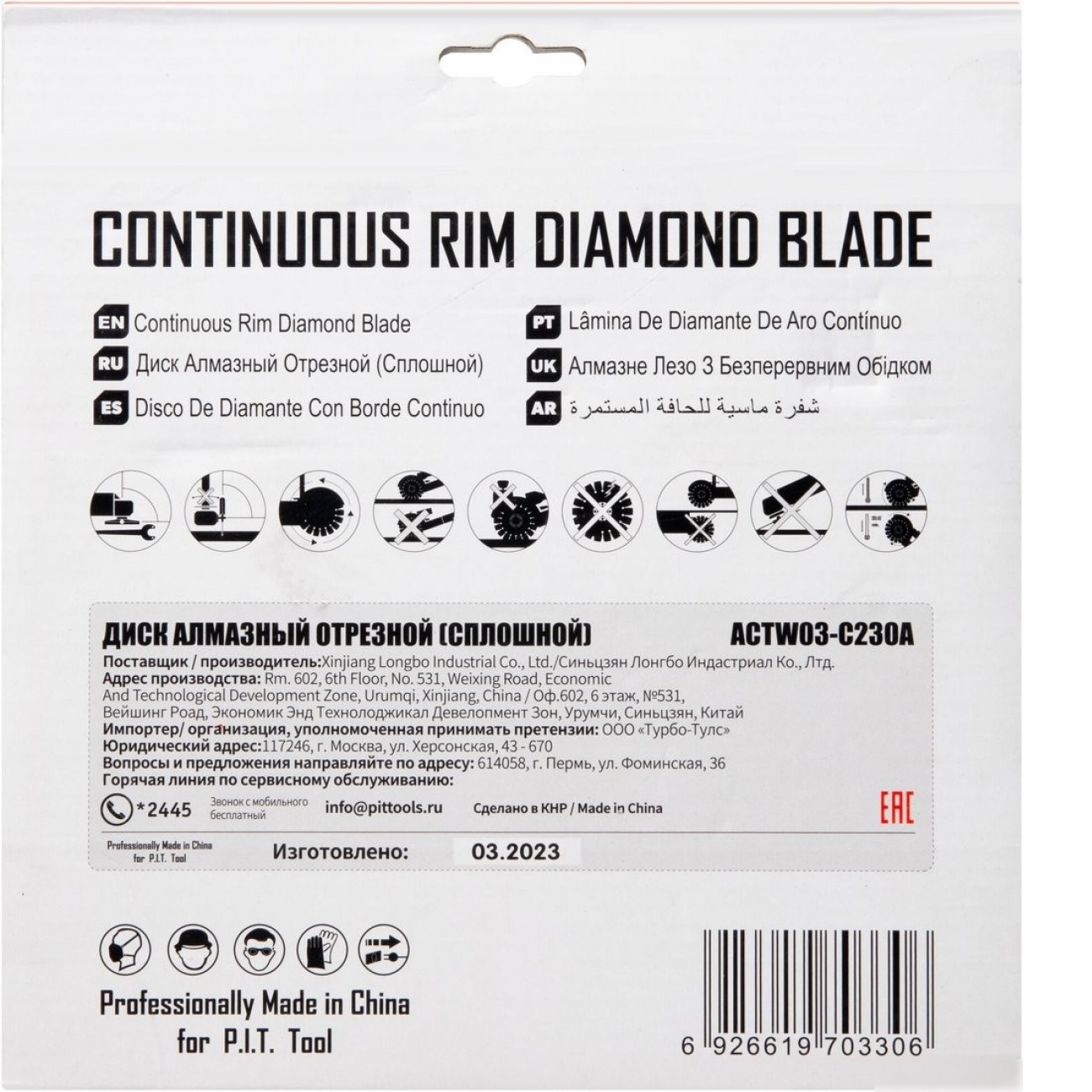 Основные характеристики Отрезной диск алмазный P.I.T. ACTW03-C230A