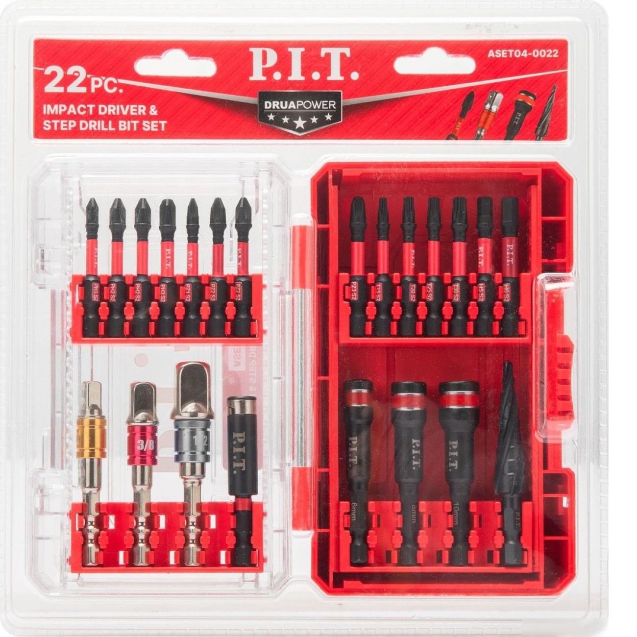 22 шт, переходник квадрат-шестигранник, головка бита/торцевая, хвостовик шестигранный, размер мама (F): 1/4", 3/8", 1/2", размер папа (M): 1/4", 3/8", 1/2", рабочий размер биты: PH1, PH2, PH3, PZ1, PZ2, PZ3, T15, T20, T25, T30, H5, H6, рабочий размер 4-12 мм