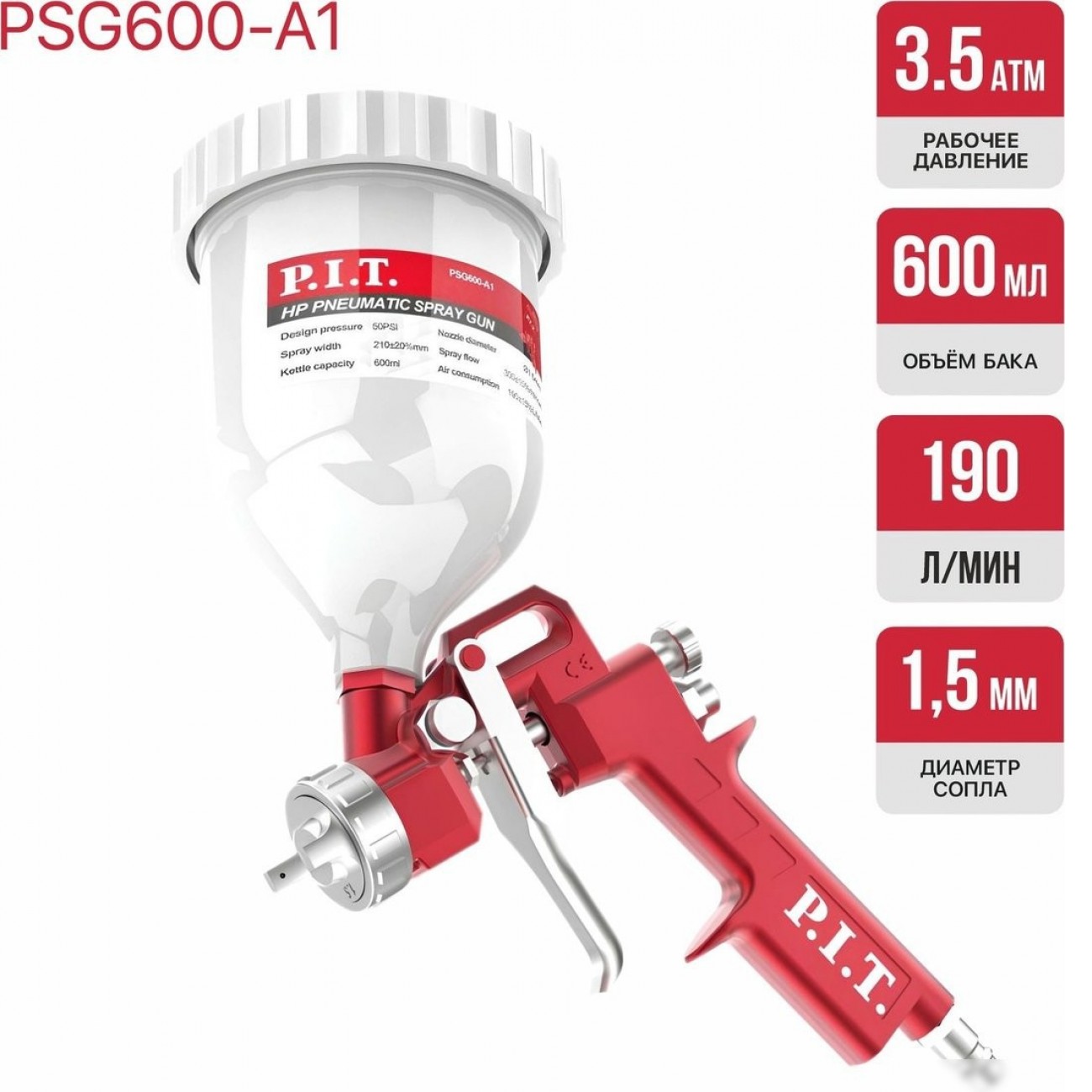 HP, расход воздуха: 190 л/мин, 3.5 бар, сопло: 1.5 мм, бачок: 600 мл