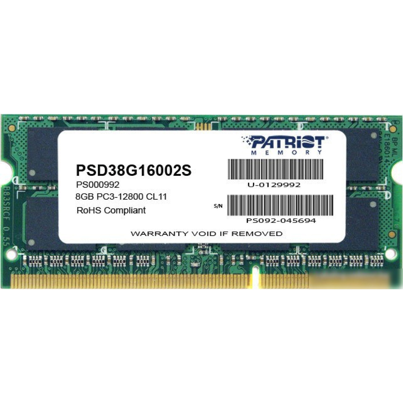 Основные характеристики Оперативная память Patriot Signature 8GB DDR3 SO-DIMM PC3-12800 (PSD38G16002S)