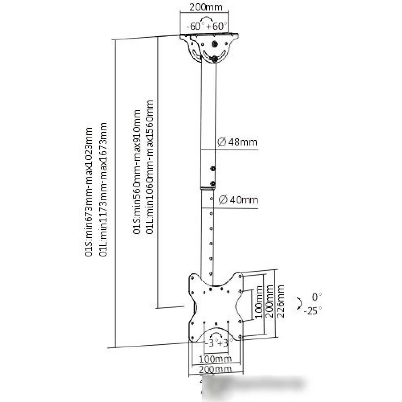 потолочный кронштейн для ЖК-телевизора 15-48", наклон 25°, поворот 180°, цвет черный