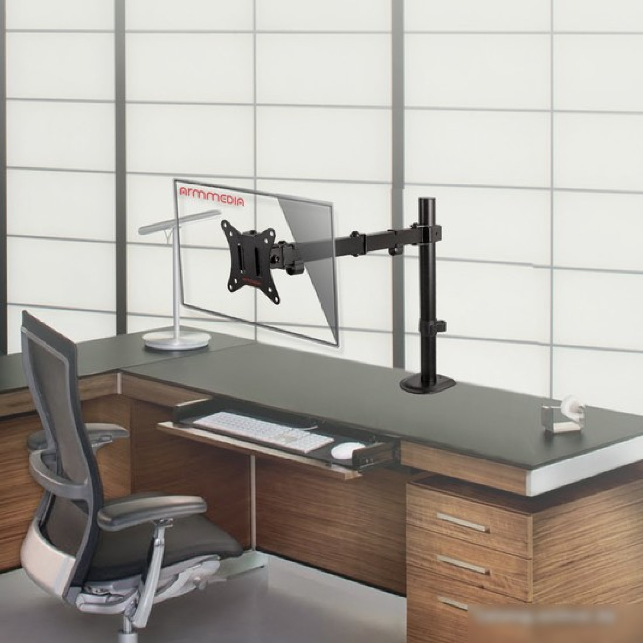 для мониторов, 17-34", 1 монитор, к столешнице, поворотный, с регулировкой высоты, кабель-канал, струбцинное крепление, наклон 45°, поворот 360°, регулировка высоты 0-407 мм, цвет черный