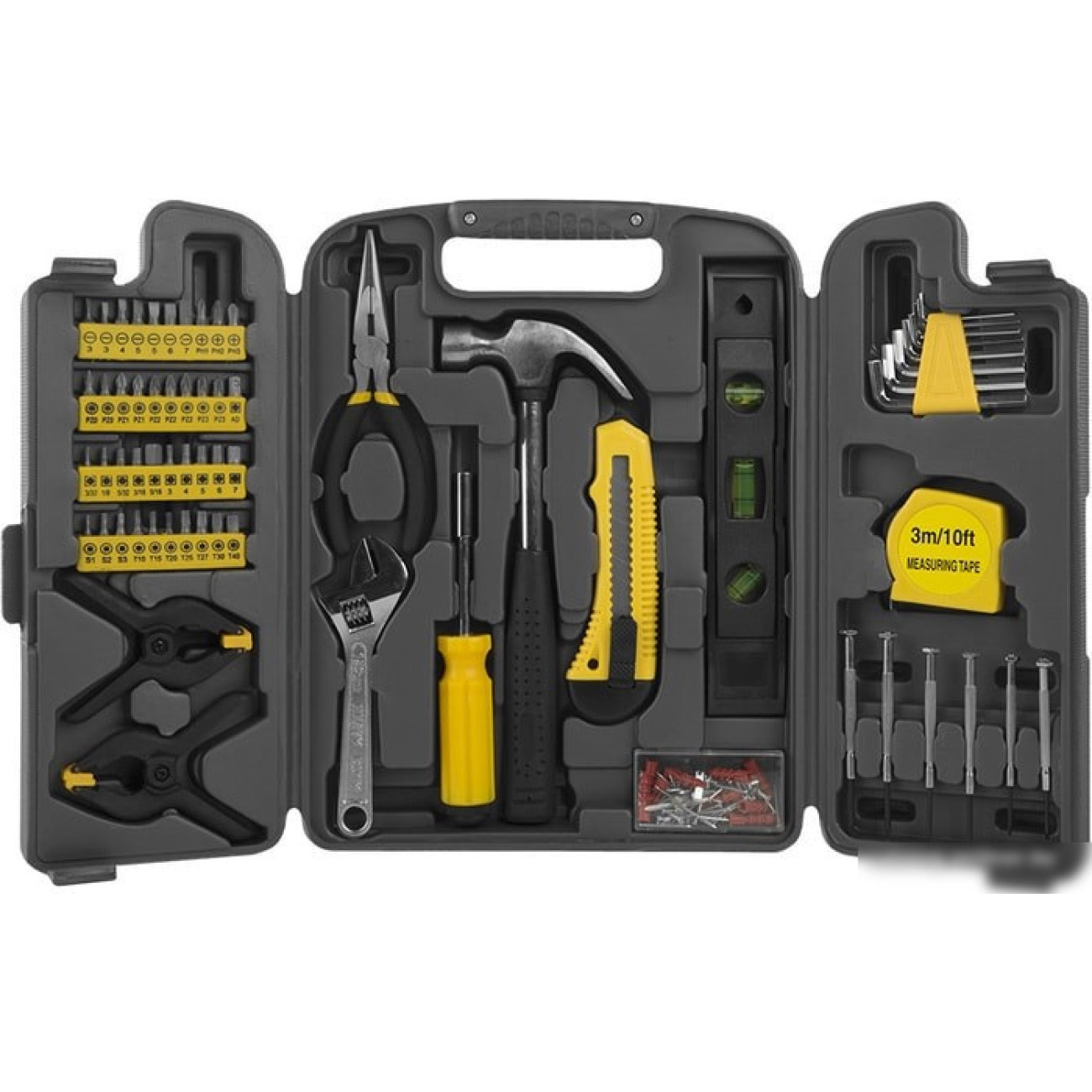 КомплектацияТонкогубцы 150 мм; Разводной ключ 150 мм; Молоток 225 г; Уровень 230 мм; Струбцины 100 мм; Держатель для бит; Рулетка 3 м; Нож; Шестигранные ключи 8 шт; Отвёртки для точной механики 6 шт; Биты 40 шт; Набор аксессуаров 80 шт.