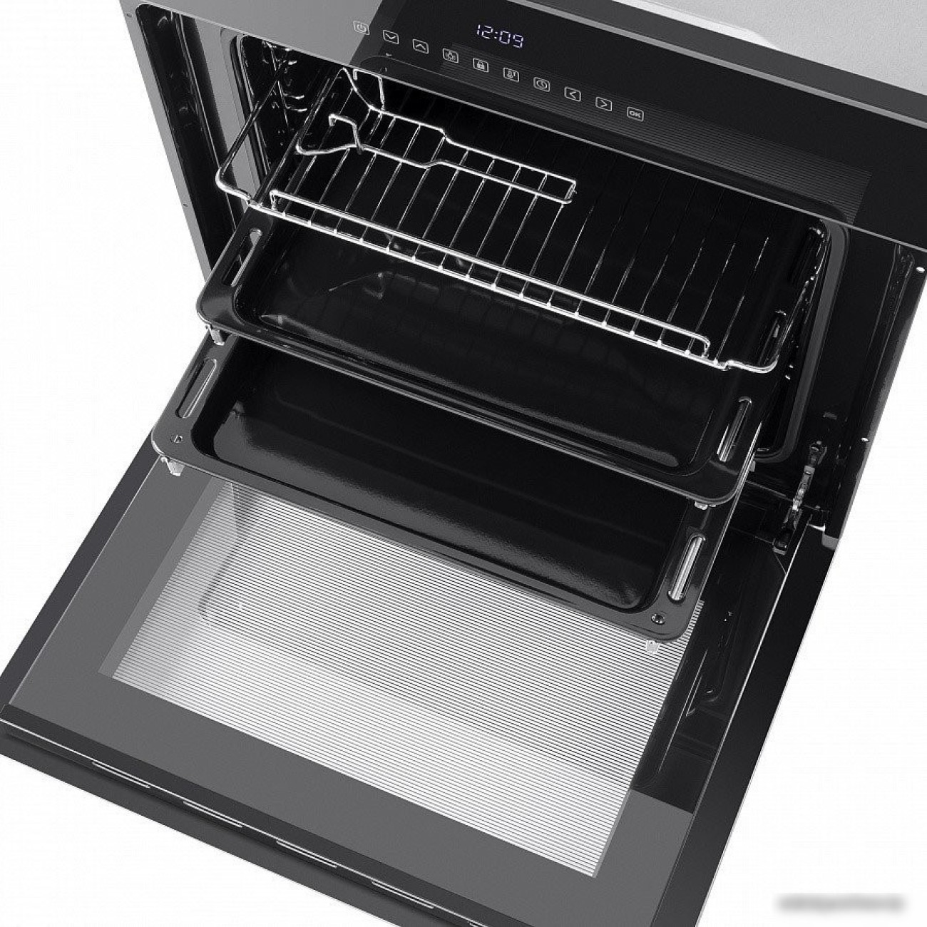 электрический с конвекцией, объем 58 л, 10 режимов, очистка ручная, проволочные направляющие, телескопические направляющие, энергопотребление A