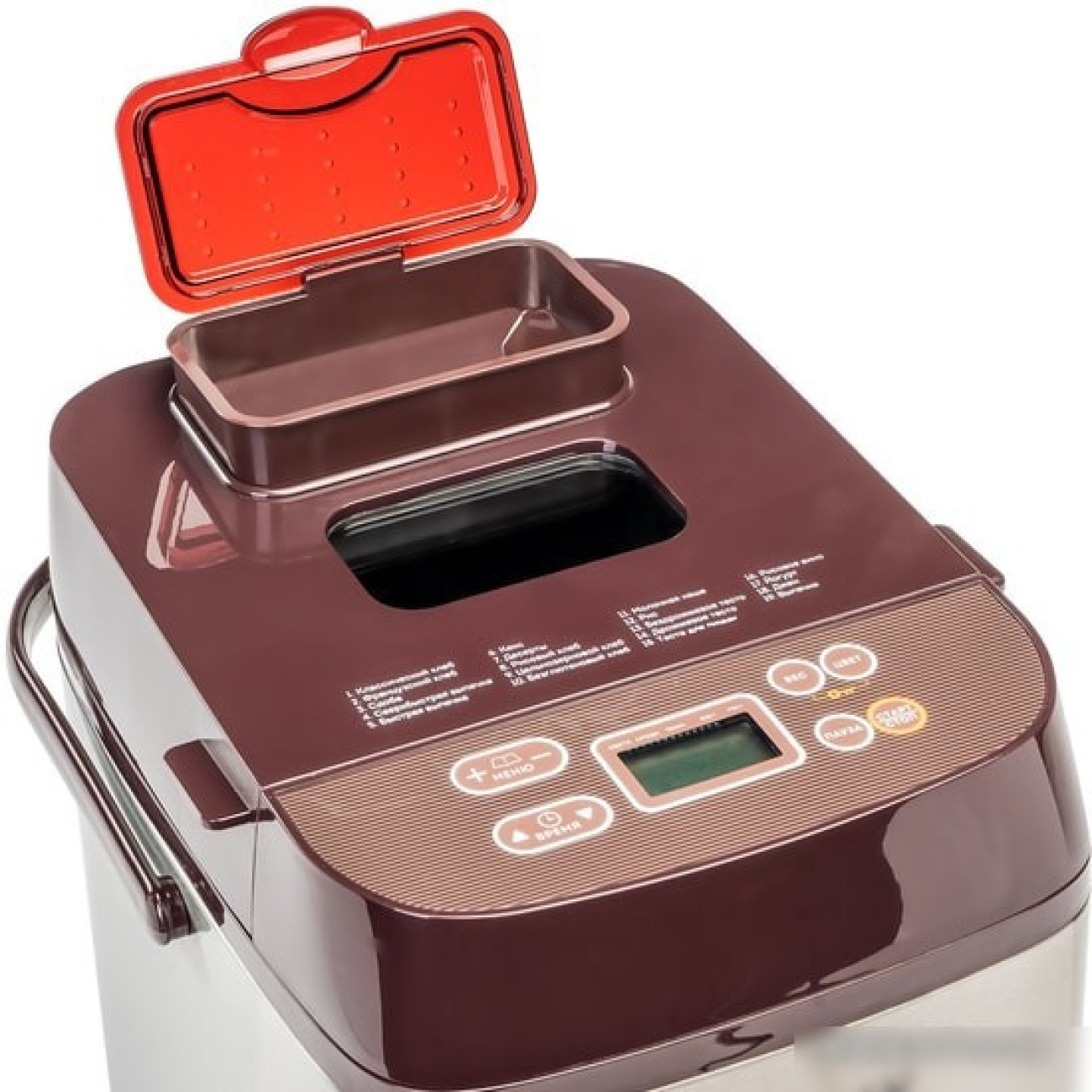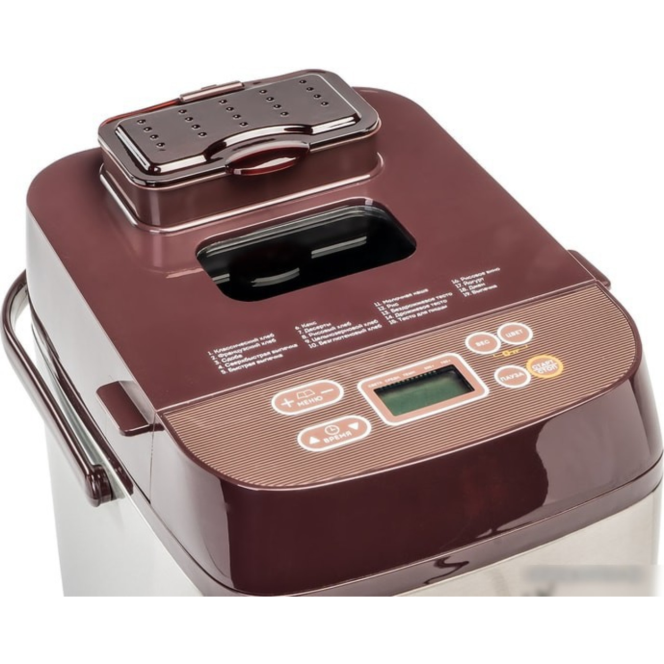 600 Вт, вес выпечки: 750 г, регулировка веса выпечки, 19 программ выпечки, выбор цвета корочки, замес теста, диспенсер