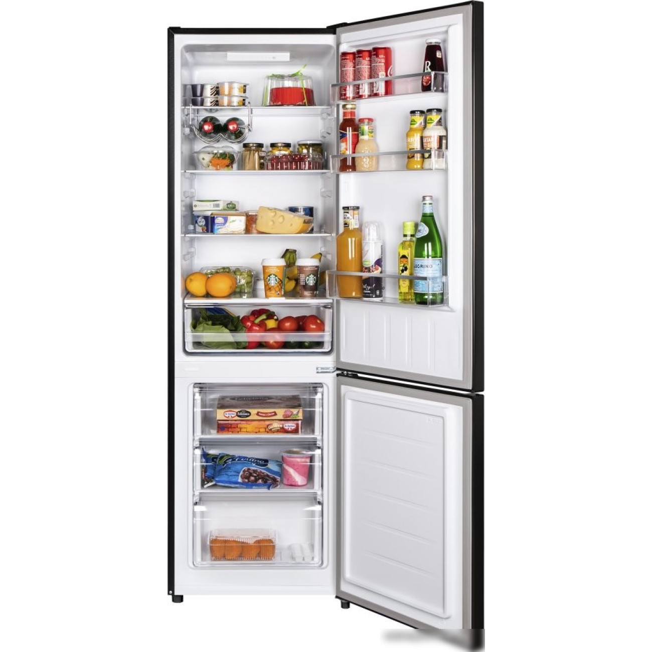 без No Frost, электронное управление, класс A+, полезный объём: 262 л (187 + 75 л), 54x55x176 см, черный