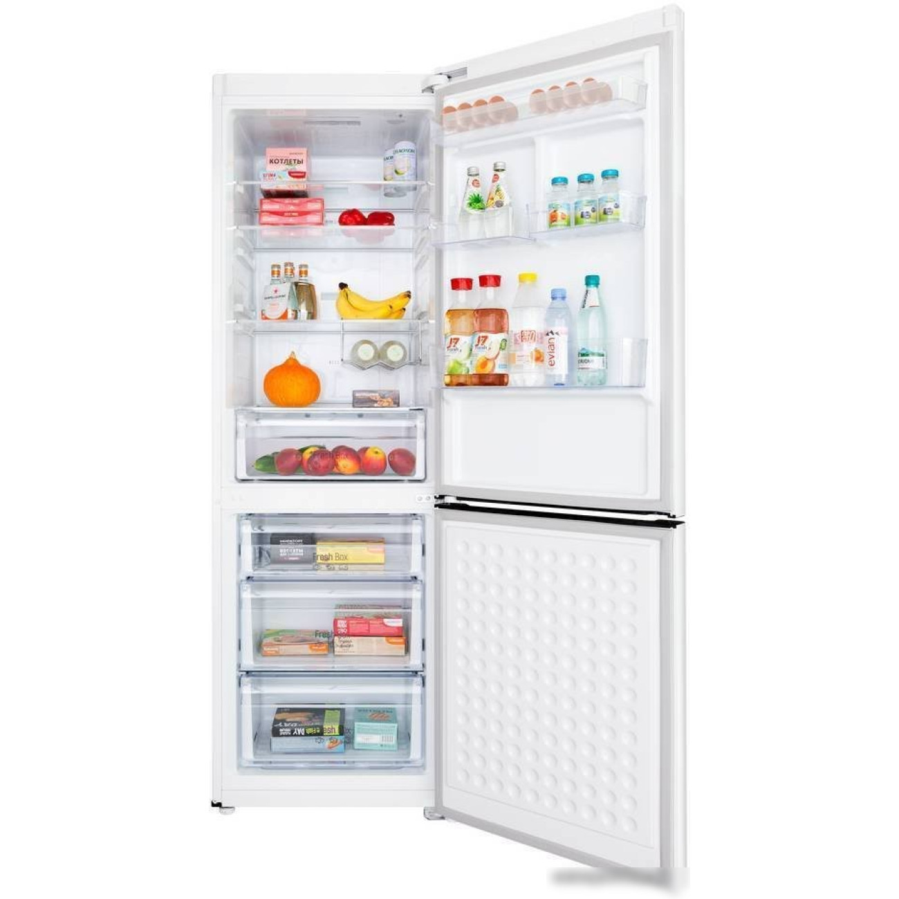 отдельностоящий, полный No Frost, электронное управление, класс A+, полезный объём: 330 л (232 + 98 л), инверторный компрессор, перенавешиваемые двери, полка для вина, лоток для яиц, 59.5x67.6x185.8 см, белый