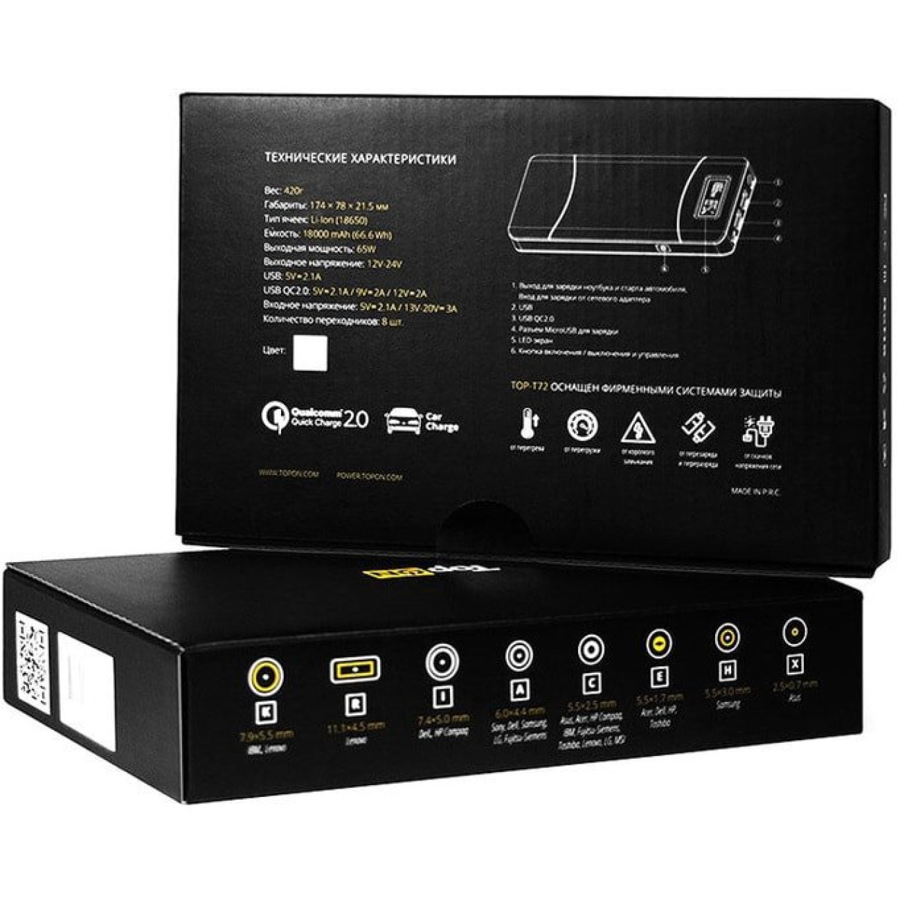 18000 мАч (66.6 Вт·ч), выходы: 3 x 5V/9V/12V/24V (3000 мА), 8 переходников в комплекте