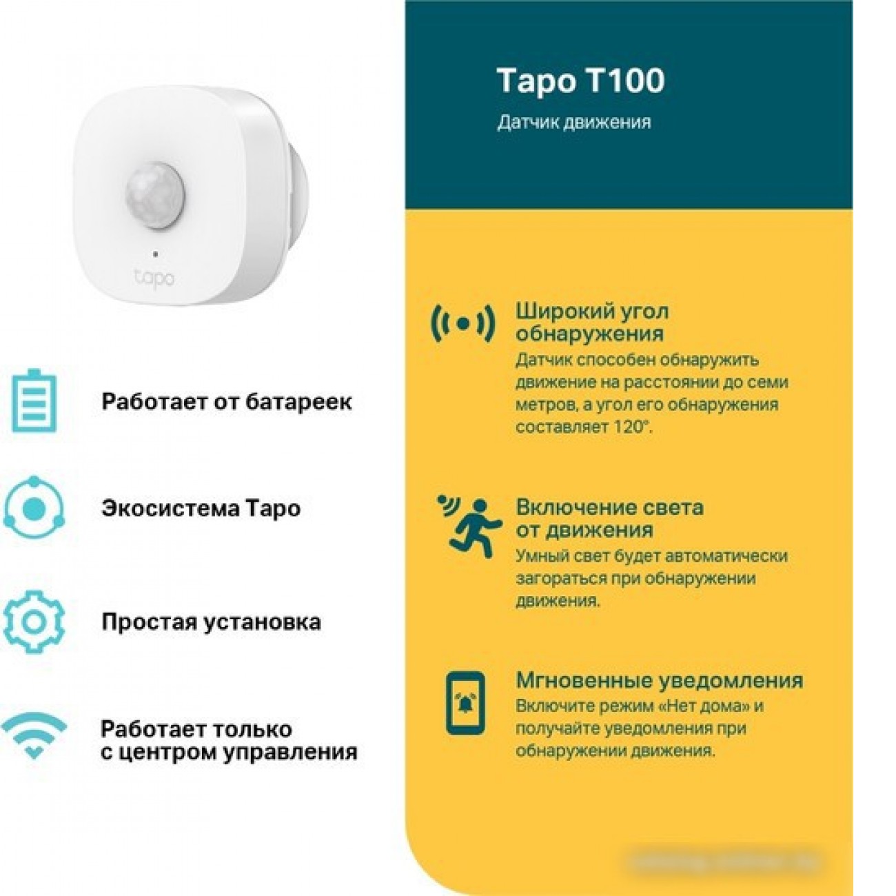 датчик движения (PIR), соединение радио, управление через TP-Link Tapo, размещение внутри помещения, питание: батарейка, световой индикатор