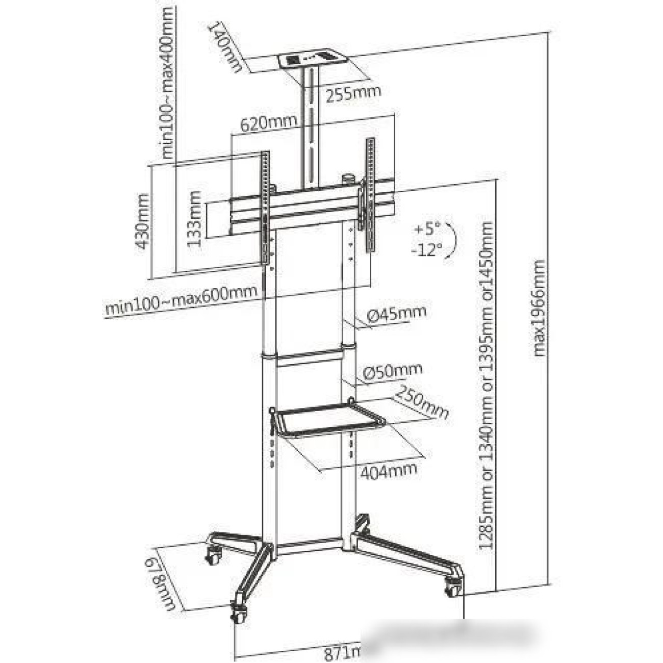 для ЖК-телевизоров, 37-75", напольный, с регулировкой высоты, с 2-мя полками, наклон 12°, цвет черный