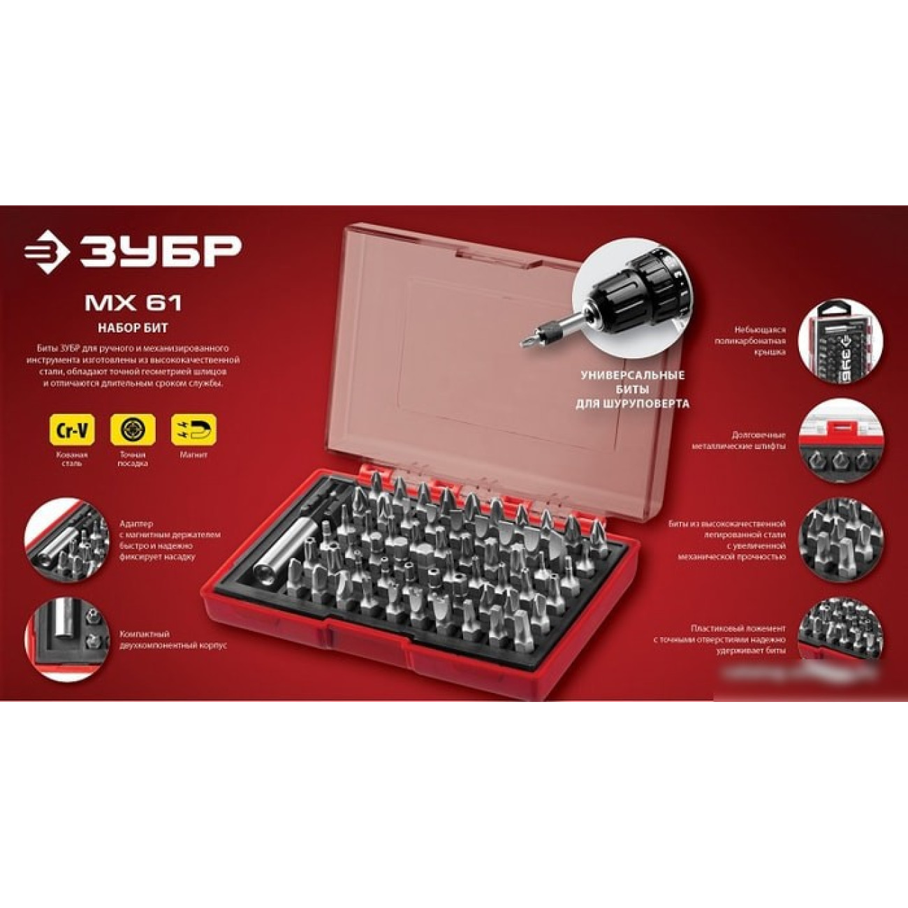 Основные характеристики Набор бит Зубр 26089-H61 (61 предмет)