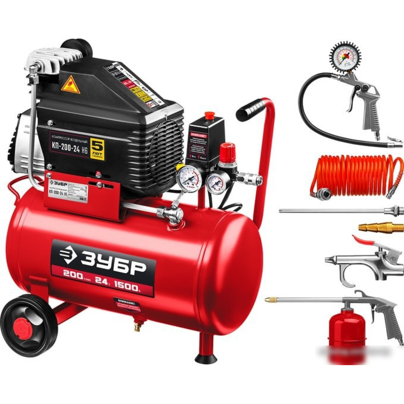 КомплектацияКомпрессорКолесо 2 шт.Фильтр воздушныйОпора резиноваяНабор крепежныйНабор пневмоинструментов:-Спиральный шланг 5 м-Пистолет для продувки-Пистолет для накачки шин, с манометром-Пистолет для вязких жидкостей, с бачком-Насадка для продувки-Насадка для накачки матрасовИнструкция по безопасностиРуководство по эксплуатации