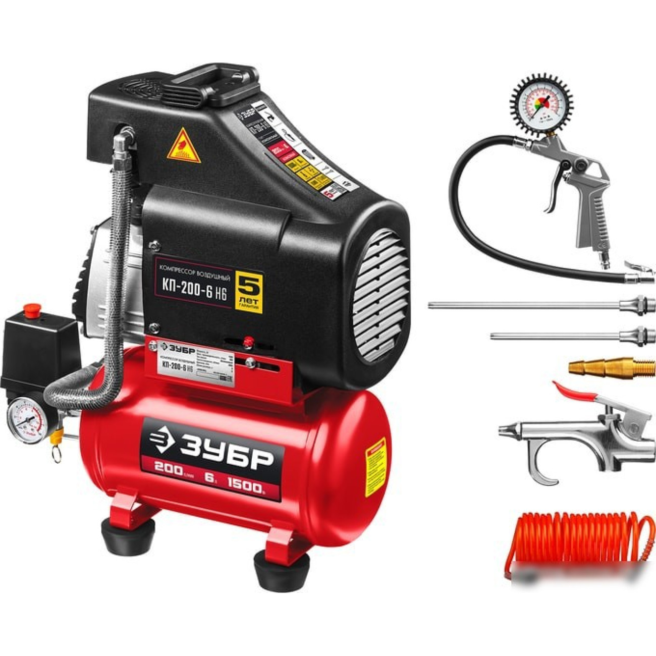 Комплектацияс манометром-Пистолет для вязких жидкостей, с бачком-Насадка для продувки-Насадка для накачки матрасовИнструкция по безопасностиРуководство по эксплуатации, КомпрессорФильтр воздушныйОпора резиновая 4 шт.Набор крепежныйНабор пневмоинструментов:-Спиральный шланг 5 м-Пистолет для продувки-Пистолет для накачки шин
