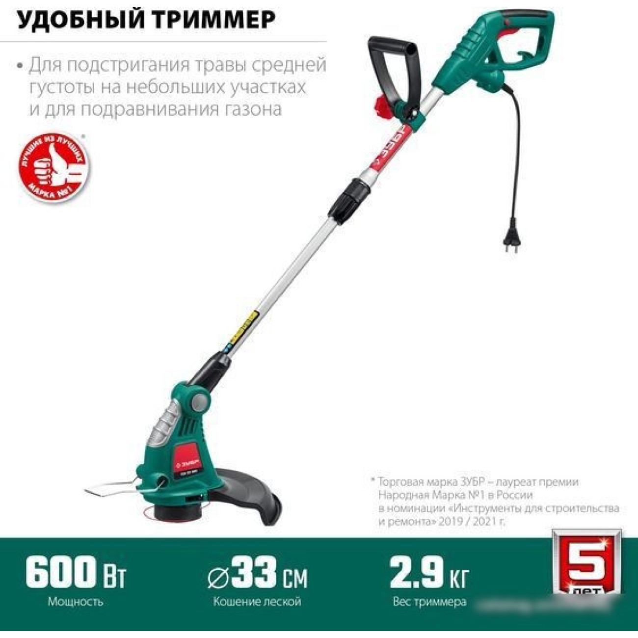 электрический, 600 Вт, оснастка: леска, ширина скашивания: 33 см, 2.9 кг