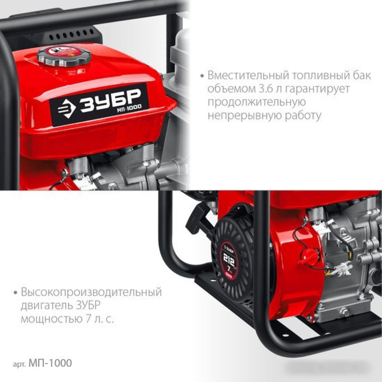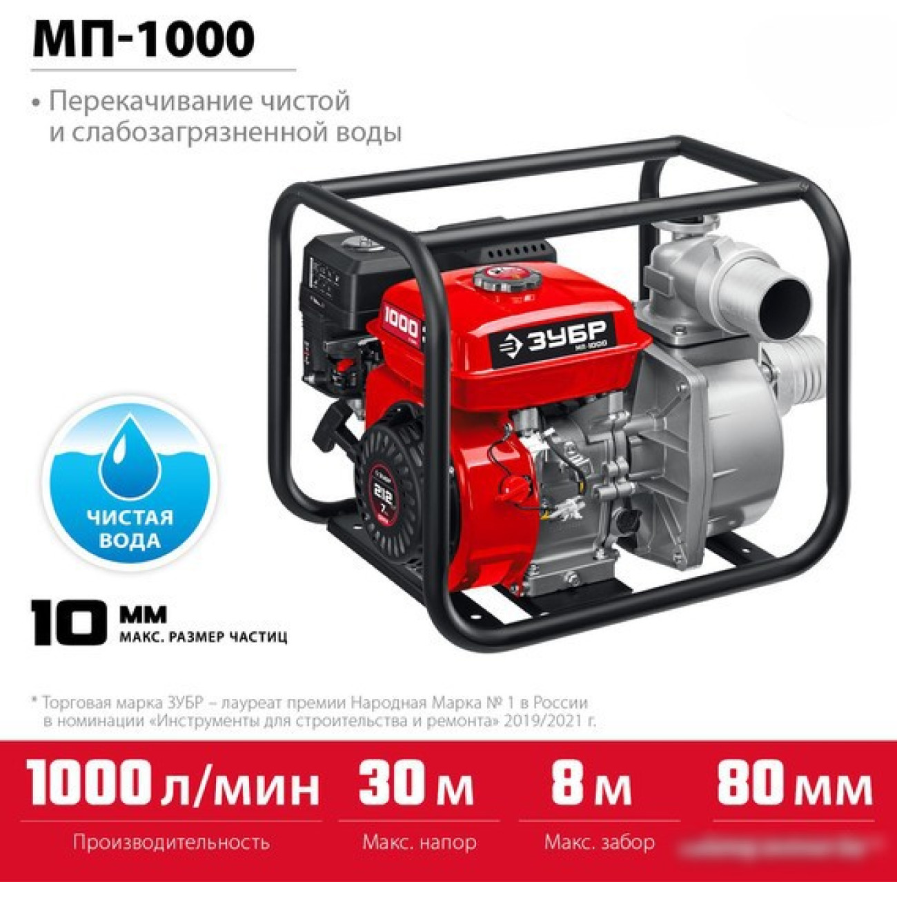 для грязной воды, бензиновый двигатель, мощность 4.8 кВт, производительность 1000 л/мин, высота подъема 30 м, бак 3.6 л, патрубки 80/80 мм